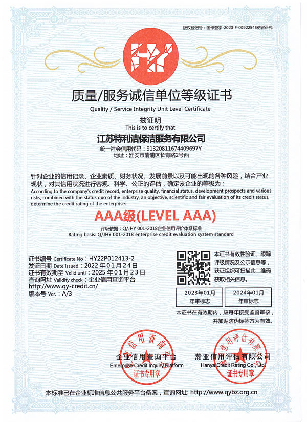 江蘇特利潔保潔服務有限公司(前稱為淮安市特利潔保潔服務有限公司),成立于2003年,于2018年經工商變更登記為“江蘇特利潔保潔服務有限公司”,是經工商部門登記注冊的合法企業。公司員工經系統培訓后上崗,本公司全部采用特利潔專業清洗設備、藥劑,并秉承了特利潔先進的管理模式,具備了專業的清洗技術、服務和網絡優勢以及一批訓練有素的專業清潔隊伍及管理人員,致力于推動淮安清洗行業朝著規范化、專業化、標準化方向發展。公司成立至今,經過我們全體員工的不懈努力,以及本著“誠信、專業、周到”的服務使得接受過我們服務的每一位客戶均能成為我們的長期合作對象。公司也從起初十幾名員工的小公司逐漸發展壯大,現已初具規模,并在保潔行業當中占據一定份額。現與恒大集團等世界500強企業建立戰略合作。2018年10月公司取得三A信用評級、三A重合同守信用單位...