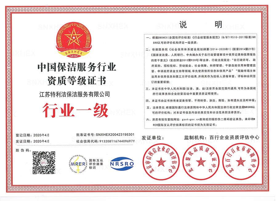 中國保潔服務行業資質等級證書